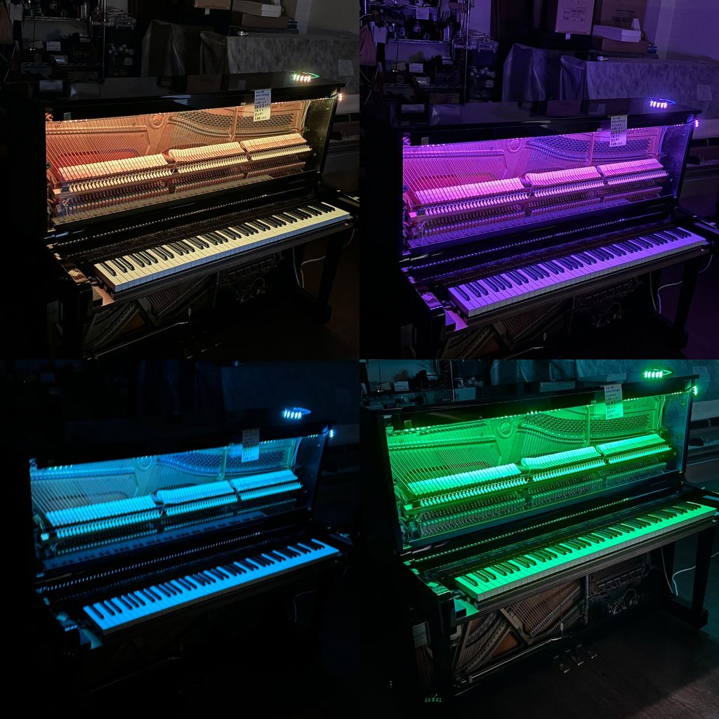 メイクアップピアノ あなたのピアノもオシャレにメイクアップしませんか メイクアップピアノは、ホワイトを基本ににお好みのカラーでポイントをつけてオシャレに完成させる方法が一般的です。ホワイトオンリーでの仕上げで、直足をチッペン、ヨーロピアンのネコ脚に変えたりも多数承り致しております。お好みに応じて、全体をレモンイエロー色や、淡いブルーや、淡いグリーン等にして、正面パネルにモールをつけたり、足をチッペンネコ脚に変えたり、いろいろ可能です。赤、黄色、グリーン、青、ピンク、メタルカラー等の色でカラフルに仕上げ、幼稚園やホール、各種イベント用にも納入させて頂いてます。他にも、ピアノの筐体の一部をアクリルなどの透明部品に変更したり、ライトアップを追加したりも可能です。世界に1台だけのオリジナルピアノを作ることができます。詳しい料金・納期などに関しましては上下のバナーよりお問い合わせ下さい。。 メイクアップピアノに関するお問い合わせはこちら 参考写真 元は黒艶出し塗装のピアノでしたが、全体を白系統の色で塗装しなおす事で、傷も無くなり明るい印象となります。差し色をする事で、おしゃれな印象を増すことができます。イスも同じ色で塗装し直し、座面も張替ます。 ピアノの正面の上前板をアクリル板へ変更する事で、ピアノの中のハンマーなどの動きが見える様にしました。 上前板をアクリルに変更したピアノを、LEDテープライトでライトアップしました。オプションで、音に合わせて光が変化するような加工も可能です。